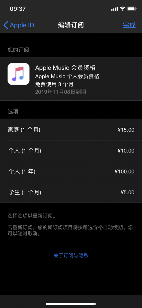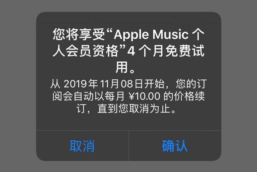 苹果音乐4个月免费试用 发表于 2019-07-09 分类于 爱好 链接:https://applemusic.co/en-us/code/5d0399799899a50015e36b34 点击“立即订阅”,然后按提示操作领取4个月免费试用。 然后,在“设置”-“Apple ID”-“订阅”里找到苹果音乐会员资格,点击“取消订阅”,这样操作是可以避免在4个月之后自动收取每月10元的费用,而且,也可以在此页面取消那些自己不用的订阅产品,以免在自己不知情的情况下被乱收费。 -------------本文结束 感谢阅读------------- 本文作者: HuangLei 本文链接: https://maxlay.github.io/2019/07/09/apple-music/ 版权声明: 本博客所有文章除特别声明外,均采用 BY-NC-SA 许可协议。转载请注明出处!