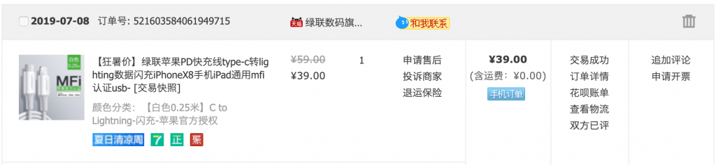 然而,最近三个月获得苹果MFi认证的线越来越多了,淘宝上出了一大堆,有Benks、Momax、ZMi、Aenzr、Cike、Belkin、Moshi、RAVPower、mophie、绿联、等等等等,价格都只是几十块。
