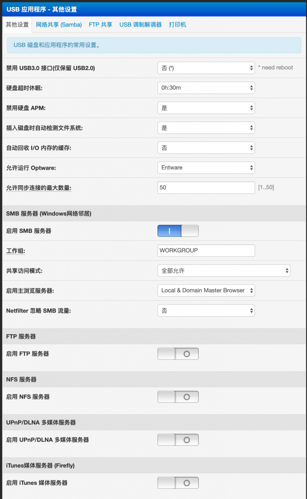 家里连接光猫的主路由是小米路由3G,是一个千兆USB3的性价比产品,官网已经不卖了,要去淘宝或者闲鱼。这次依然用Padavan固件「http://huanglei.site/?s=padavan」来实现SMB服务,如果你不需要AdGuard Home ,我可能更推荐Hanwckf的固件「https://github.com/hanwckf/rt-n56u/releases」,比Padavan的固件「https://opt.cn2qq.com/padavan」更加小巧,用来SMB更稳定,网上也有Padavan和Hanwckf固件的网速对比。同样的硬件刷不同的固件,因为芯片的驱动程序和算法的不同,居然网速和稳定性会有很大差别,太玄幻了。另外,路由的USB口连接一个USB3扩展分线器,分线器上插了一个被格式化成EXT4的4G容量的2.0U盘用来opt,另外再插两个双盘位的USB3.0的硬盘盒,四块被格式化成EXFAT的2.0T容量的WD3.5寸硬盘用来存数据。这样做,防止频繁的opt调用机械硬盘,机械硬盘在不使用时可以休眠减少损耗。opt是用来开AdGuard Home等程序的,刷Padavan的魅力就在opt。