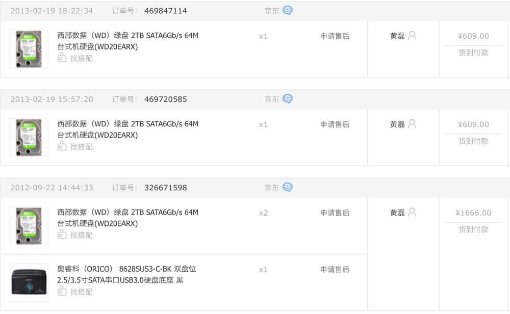 2012/2013年在 JD买了4个2T共8T的机械硬盘(一共花了2884元)