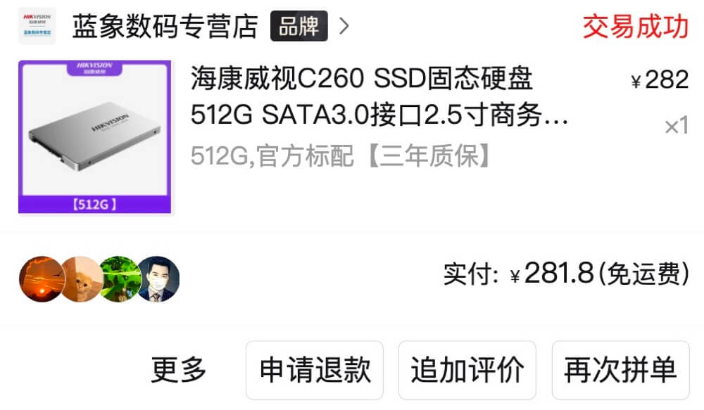 2022年3月15日在 JD买了一块512G的海康SSD硬盘(281.8元)