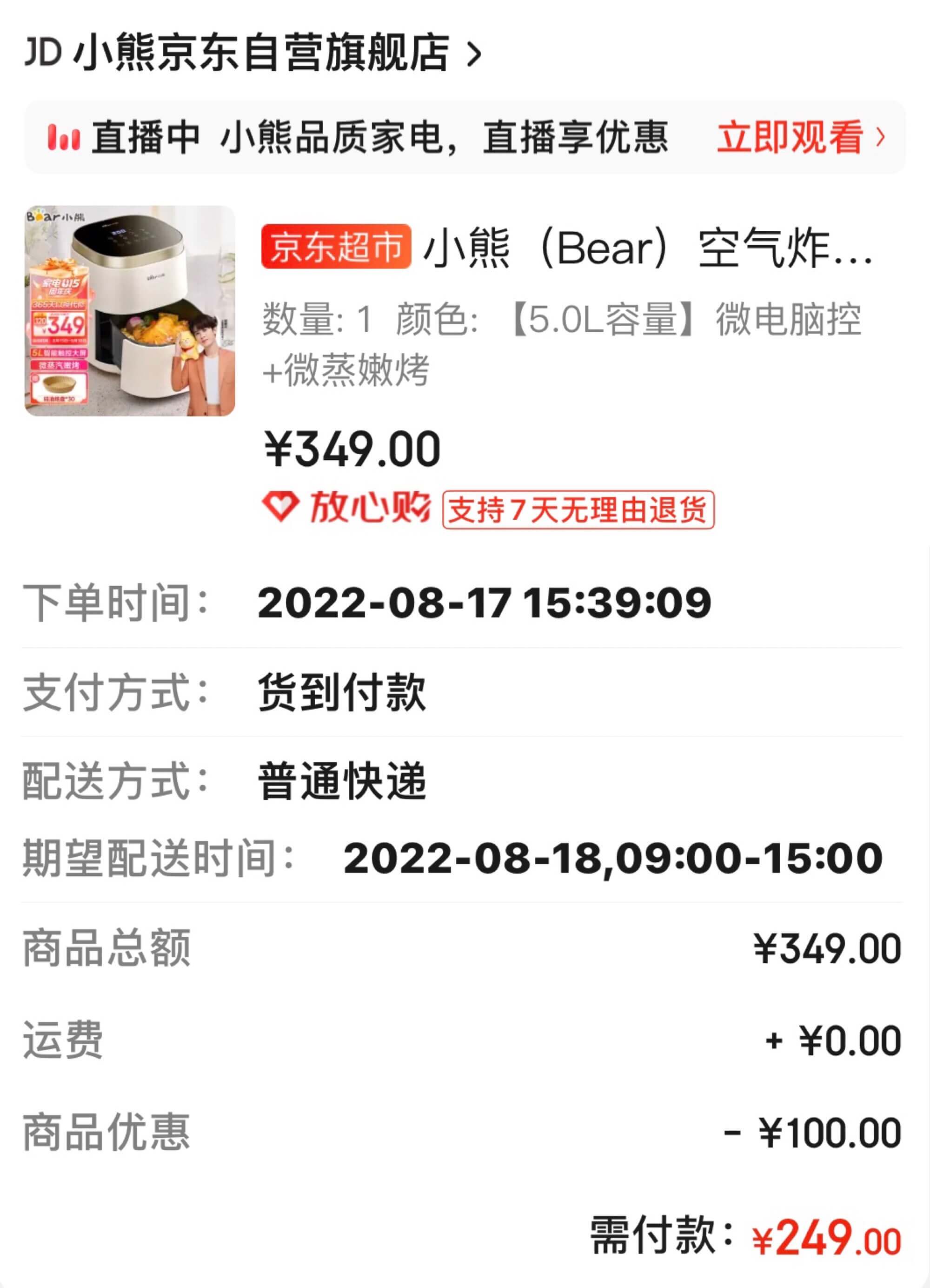小熊空气炸锅 发表于 2022-08-17 分类于 买货 最近要买个空气炸锅,在各平台找评测看,抖音心领神会的给我推荐了小熊空气炸锅的直播带货。在抖音上买电器,运输和售后我都是有所顾忌的。那我去京东看看,领券后即是抖音的价格,东西又是京东负责送货上门,7天无理由退货,并且还货到付款,鱼和熊掌兼得,美滋滋。 https://u.jd.com/7dtLb4U -------------本文结束 感谢阅读------------- 本文作者: HuangLei 本文链接: https://maxlay.github.io/2022/08/17/小熊空气炸锅/ 版权声明: 本博客所有文章除特别声明外,均采用 BY-NC-SA 许可协议。转载请注明出处!