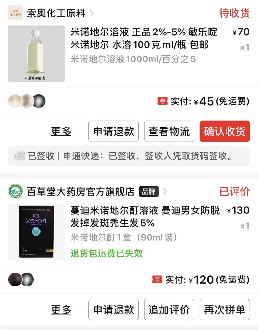 “米诺地尔”是OTC,网上药店和线下药店都能买到。一开始我买的是品牌药,之后就干脆买5%的原料,甚至都不用考虑稀释,直接用,唯一的区别就是药品没有包材,没有品牌溢价,药效并没有区别。