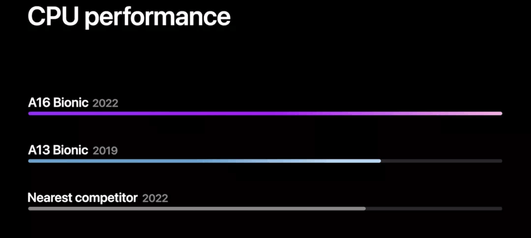 作为一台 24 * 7 * 365 待命的人体外器官,这次发布的iPhone 14 Pro、Pro Max 搭载最新的 A16 仿生芯片,采用台积电 4nm 工艺,集成 6 核 CPU、5 核 GPU、16 核神经网络引擎。苹果宣称,与 iPhone 最接近的竞争对手,CPU 性能也不及 iPhone 11 上的 A13 芯片。