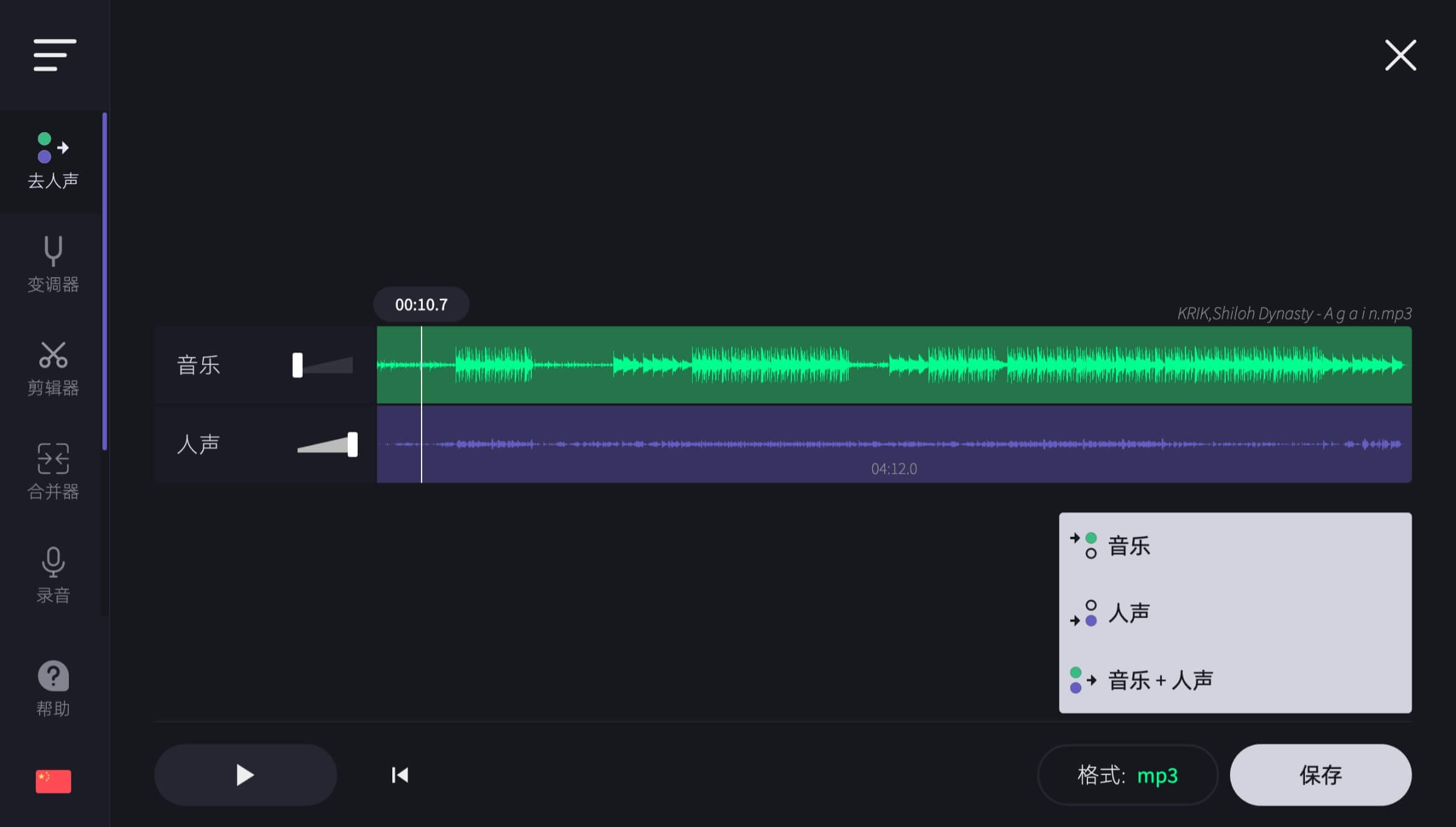 网上有很多音乐和人声分离的服务,vocalremover是免费的,比大部分收费的都要优秀,出货品质很高,分离很干净,实现卡拉OK自由。