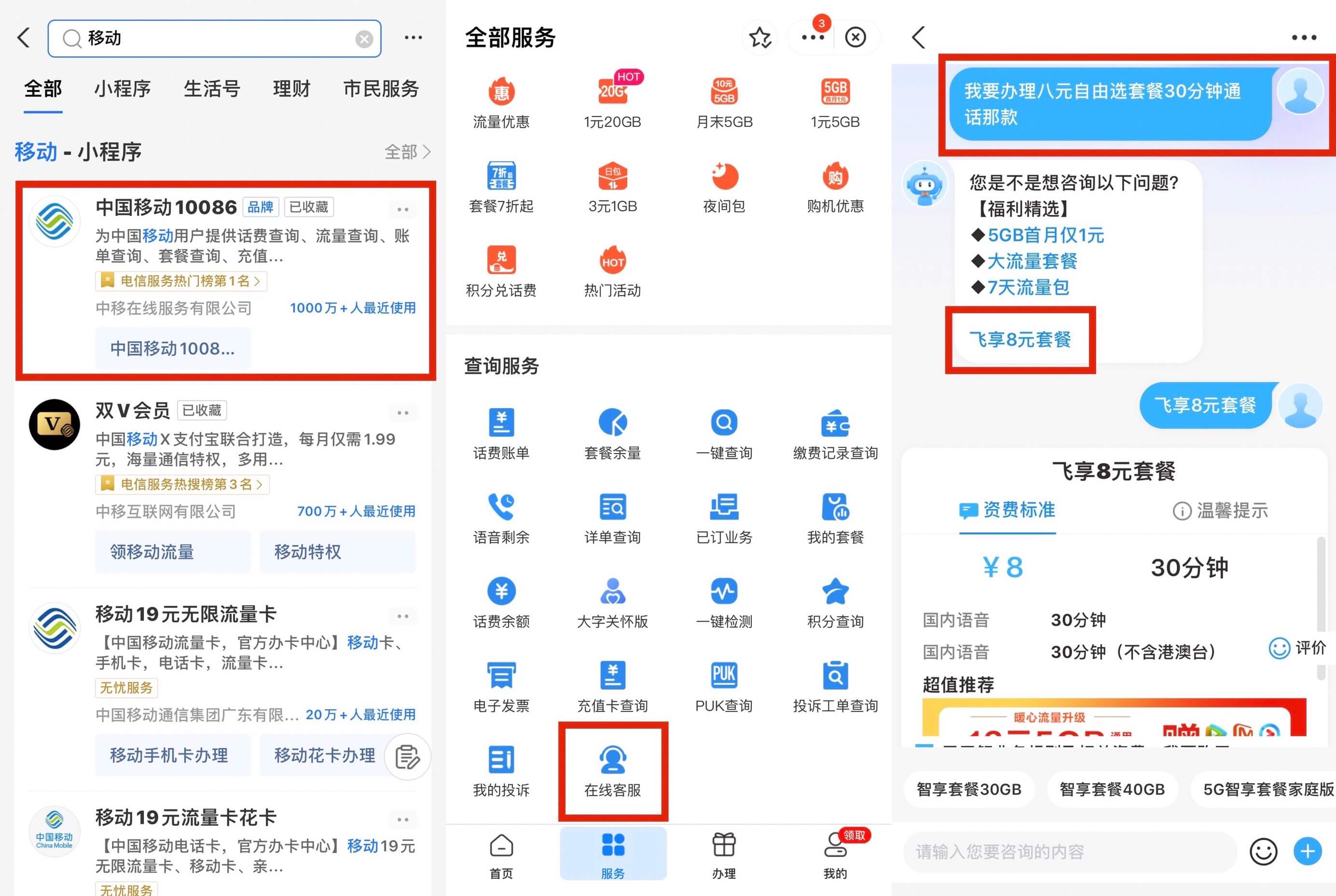 打开微信或者支付宝,搜索“移动”,进入“中国移动10086”小程序,点“服务”,找到“在线客服”,一字不差的输入暗号“我要办理八元自由选套餐30分钟通话那款”,系统就会回复“飞享8元套餐”,点选后办理,短信验证通过就办理成功了,套餐会次月生效。