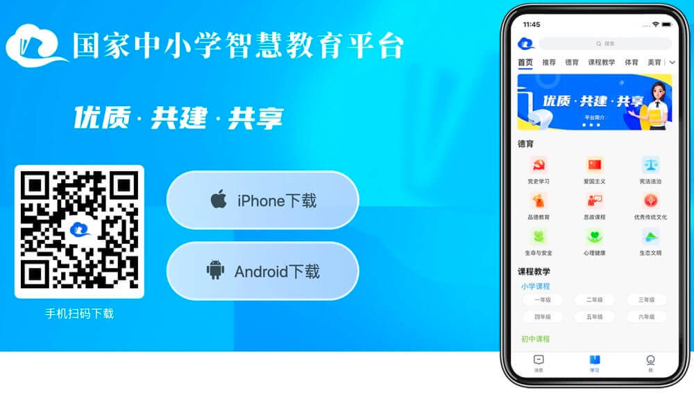 国家中小学智慧教育平台 发表于 2022-11-03 分类于 学习 https://www.zxx.edu.cn/syncClassroom 国家级智慧教育平台,从小学一年级到高中三年级全科视频教程 https://www.zxx.edu.cn/tchMaterial 义务教育全科全套教材 https://www.zxx.edu.cn/download_app APP下载 -------------本文结束 感谢阅读------------- 本文作者: HuangLei 本文链接: https://maxlay.github.io/2022/11/03/国家中小学智慧教育平台/ 版权声明: 本博客所有文章除特别声明外,均采用 BY-NC-SA 许可协议。转载请注明出处!