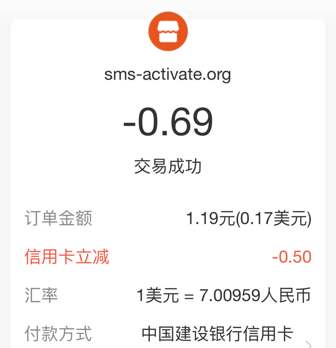 用Telegram注册并登陆这个接码网站,点充值,选支付宝,金额填0.162美元,加上3.2%的手续费,实际会形成一个0.17美元的支付码。用手机支付宝扫描付款时我选择了建行信用卡,立减了0.5元,实际支付成功0.69元人民币。