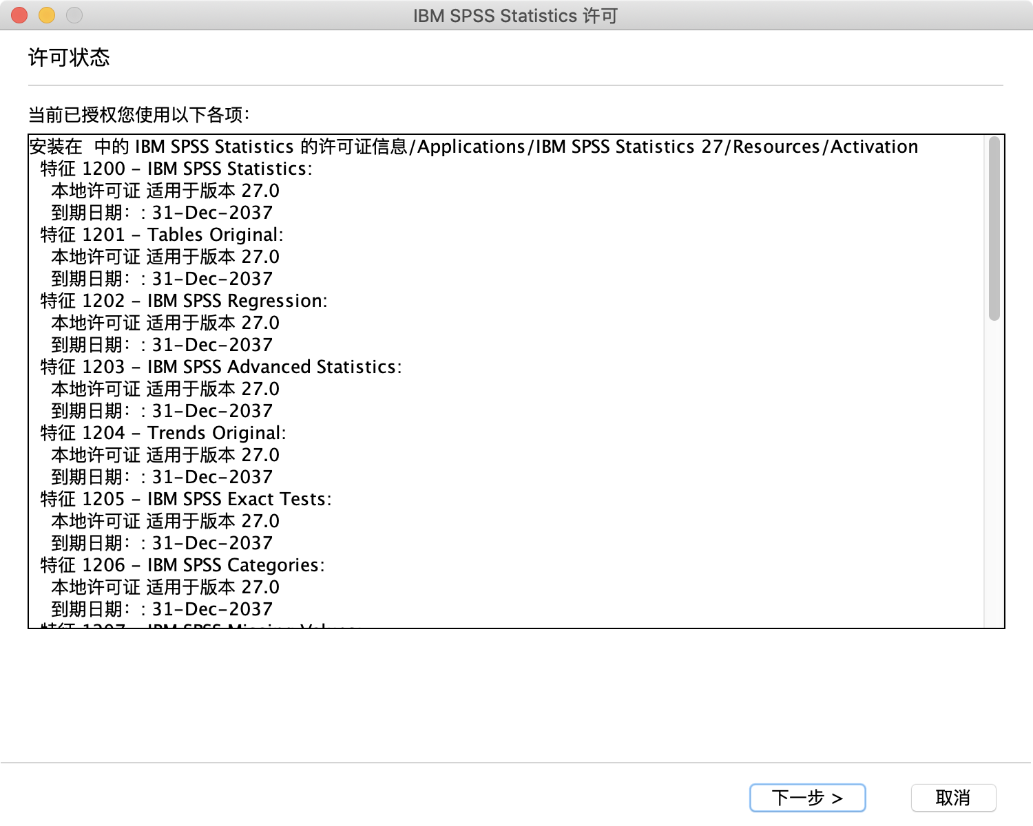 再将lservrc证书文件拷贝到/Applications/IBM SPSS Statistics 27/Resources/Activation目录下